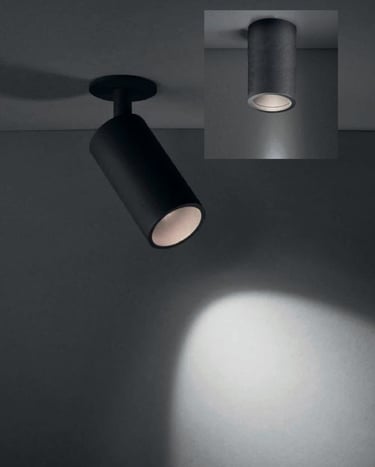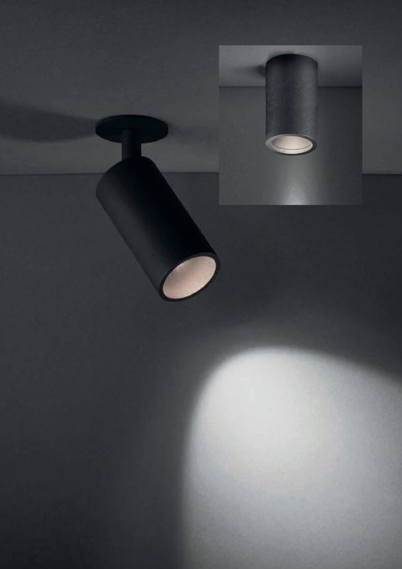 Proyector negro pensado para espa- cios donde es necesario incorporar un punto de luz. Está fabricado en alu- minio y tiene un difusor de policarbo- nato transparente. Es orientable tanto vertical como horizontalmente.